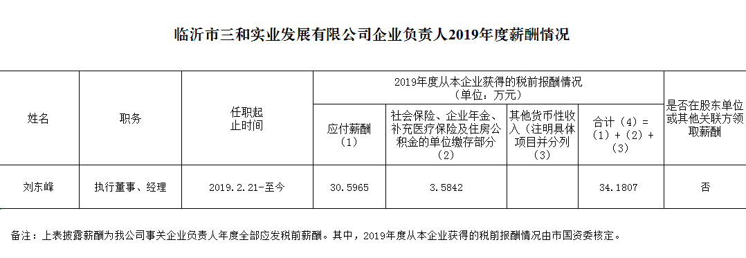 臨沂市三和實業(yè)發(fā)展有限公司企業(yè)負(fù)責(zé)人2019年度薪酬情況